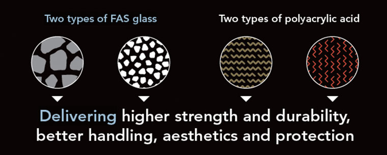 Advanced Glass hybrid technology is the combination of two types of Fluoro-Almino-Silicate(FAS) glass and also two types of polyacrylic acid.